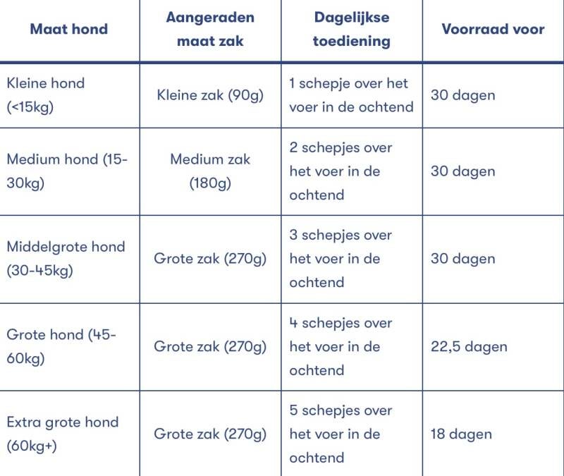 Houd altijd dit voederadvies aan. Geef voor optimaal resultaat de Dental Powder+ ‘s ochtends gemengd met de brokken van jouw hond.
